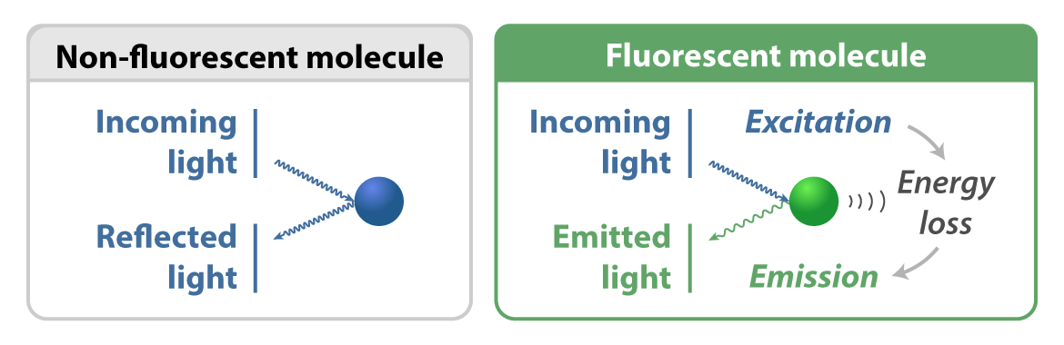 Light is made up of massless particles called photons, the tiniest possible packets of electromagnetic radiation. When photons hit special molecules responsible for fluorescence — called fluorophores — they excite electrons that had been buzzing around at their most stable “ground state.” The excited, higher energy state does not last long. During relaxation, the fluorophores re-emit the light they had absorbed. This time, the light has a longer wavelength and thus a different color.